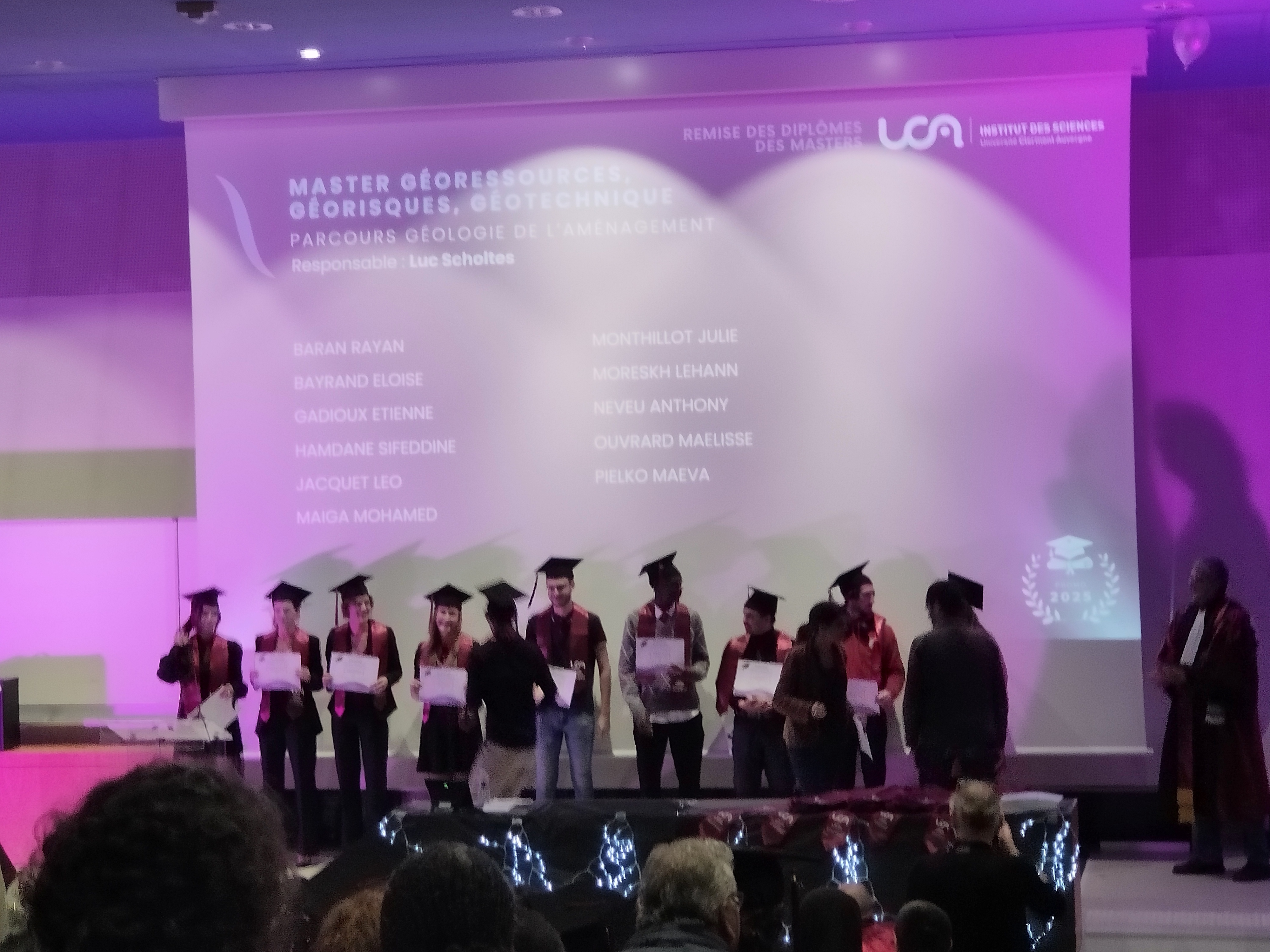 Le 7 novembre dernier, dans l'amphi de la Rotonde de Clermont-Ferrand, les étudiants de Masters 2 STPE et 3G de l'Ecole de l'OPGC (promo 2024-2025) ont reçu, des mains de leurs parrains et directeurs de formation, l'écharpe et le chapeau symbolisant la promotion 2025.
